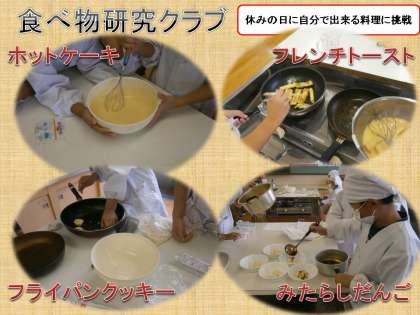 食べ物研究クラブでは,『休みの日に自分で出来る調理」をテーマにグループごとで調理実習をしました。