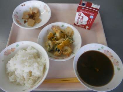 「なつやさいのかきあげが,1つ1つの野菜に味がしっかりしみこんでいて,おいしかったです。あかだしも,こい味だったので,ご飯によく合いました。これからもおいしい給食を作ってください。」・・・6の2