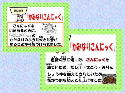 『かみなりこんにゃく』は,こんにゃくをごま油で炒める時の音が,バリバリと雷がなっているようだということから名前がつきました。