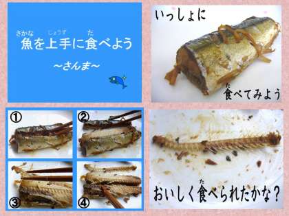 今日の給食は,これから旬をむかえる「秋刀魚(さんま)」を使って『さんまのしょうが煮』でした。さんまの食べ方を「給食室からこんにちは」の電子紙芝居10枚で紹介しました。低学年の子どもたちは,一つ一つ画面を見て丁寧に実践したことで時間はかかりましたが 見事に骨だけを取リ除くことが出来たようです。実は,学校の回転釜でさんまを煮つけると,圧力釜で煮たかのように骨まで軟らかくなります。高学年の子どもたちの中には,「さんまは骨までやわらかいよ。」といって,骨ごと食べている子どもも多くいました。