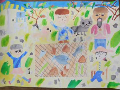 物語を聞いて絵を描く「お話の絵」に挑戦しました。クラスごとに,「まんげつの夜,どかんねこのあしがいっぽん」「返そう 赤ちゃんゴリラをお母さんに」「ようこそ、ペンション・アニモーへ」の物語を聞いて,場面を想像しながら描きました。どの作品も,個性溢れる素晴らしい作品に仕上がりました。