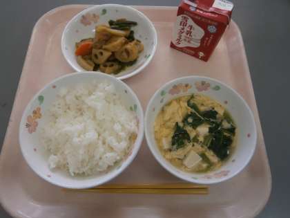 今日の給食は,これから旬を迎える「れんこん」や「ごぼう」を使った『筑前煮』でした。「ちくわ」や「とりにく」のうま味が根菜「れんこん」「ごぼう」「にんじん」によくしみていました。『かきたま汁』との組み合わせが絶妙で 大人にも大人気です。
