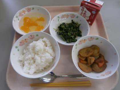「ほうれんそうとじゃこのいためもののなかのじゃこがカルカリしておいしかったです。ひらてんのなかのおにくがやわらかくておいしかったです。」・・・つくし5ねん