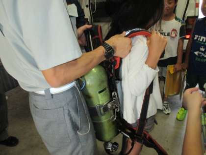南浜消防出張所の事務所,トレーニングルーム,炊事場,消防車,救急車の中を見学しました。10kgのボンベを背負わせてもらいました。