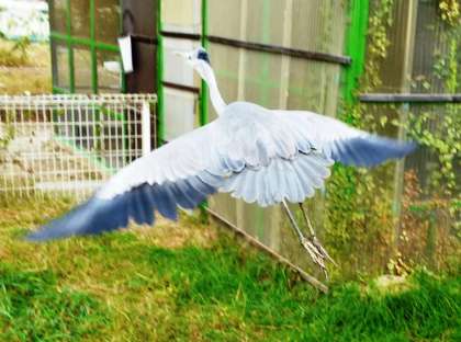 脚に引っかかっている、釣り糸をはずしてやれないかと、私が近づくと、さすがに大きな羽を広げて、お隣の月桂冠本社の屋根に逃げていきました。