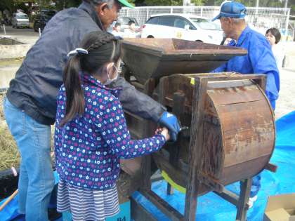 脱穀をした後に,風の力でお米の大きさを分ける唐箕という道具を使いました。この道具も初めて見るので,風の力で分けることや,道具のつくりにも興味をもって取り組んでいました。