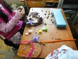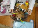 今日はあさがおのつるで「リース作り」をしました。つるを支柱から外し、つるを丸めてモールで留めたものに飾り付けをしました。どんぐりや松ぼっくり、折り紙やボタンなど、みんな想像力を膨らませ色々なデザインのリースを作りました。