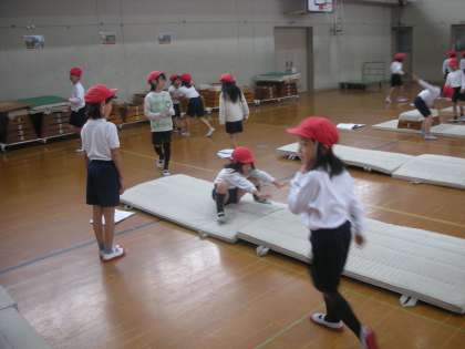 2年生の体育の学習は,学級ごとに種目をローテーションして進めています。内容は,マット運動,ボール蹴りゲーム,パスゲームです。マット運動では,今できる技をきれいにしたり,新しい技に挑戦したりしています。子どもたちは新しいことを吸収していくので,どんどんうまくできるようになっています。