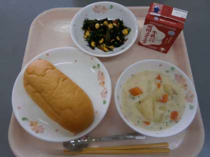 今日の給食は,手作りのルーでじっくり煮込んで仕上げる『じゃがいものクリームシチュー』でした。
