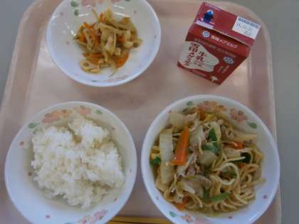 副菜は,根菜「にんじん・れんこん・ごぼう」を使った『根菜のピリカラ炒め』でした。シャキシャキとした食感とさわやかな酸味・ピリッとした刺激が食欲を増しました。