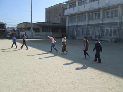 自分の一歩分の歩幅を調べ,運動場の距離を測りました。