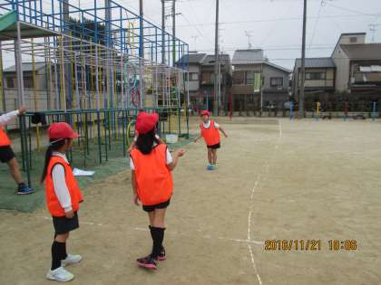 この日は,ウォーミングアップに5分ほどのランニングと「川オニ遊び」を取り入れました。中央の川幅が異なる一本の川を飛び越します。「川にはまらないように飛び越しましょう。」子どもたちは,自分がとべるであろう川幅のところめがけて助走をつけて飛び越していました。「はまったらダメ!」と緊張感を入れます。動きができたころに「川の怪物=先生」が登場します。「怪物にタッチされないように飛び越しましょう。」子どもたちはキャーキャー言いながら川の怪物のタッチをかいくぐって跳び越します。オニがあっちに行っている間にこっちを跳び越えている子がいます。「タッチされた人は川の怪物になります。怪物が増えます。」こうなるともうパニックです。ギャーギャーと叫びながら怪物の隙間を狙います。「生き残った人に拍手!」「がんばったオニさんにも拍手!」とお互いをねぎらいます。体も心も温まって,さあ「とびくらべ」です。