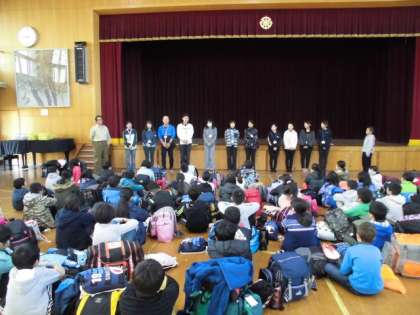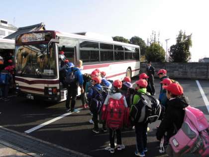 11月22日(火),少し暖かく,晴天の中,5年生の「花背山の家長期宿泊学習」1日目がスタートしました。出発式では,校長先生のお話や引率教職員・学生ボランティアの紹介,諸注意等があり,その後,バス2台に乗って花背山の家に向けて元気に出発しました。朝早くから見送りに来ていただいた保護者の皆様,ありがとうございました。
