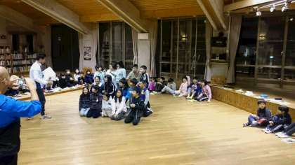 全体ミーティングの中で,昼間に行った「スコアオリエンテーリング」の表彰を行いました。グループで協力して,様々な場所を探索したことで,今日のめあてである「友情・協力」の大切さを改めて感じたようです。