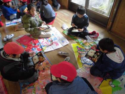 みんなで敷物を敷いて、ピクニック気分で食べました。