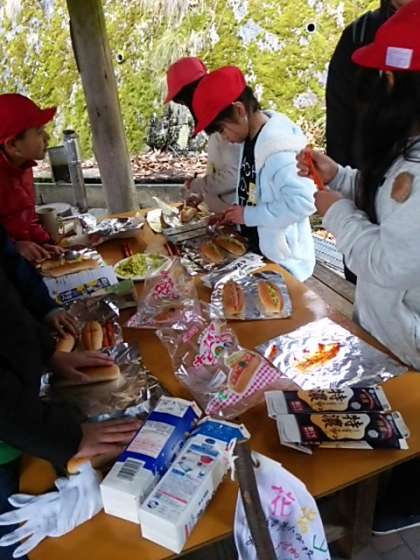 パンにカレー味のきざんだキャベツをはさみ,その上にソーセージをのせてパックドッグを作っています。