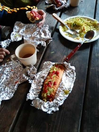 食材をはさんだパンをアルミホイルで包み,牛乳パックに入れて火にかけます。牛乳パックが燃え尽きれば完成です。少し焦げたのもまた香ばしくて美味しいようです。