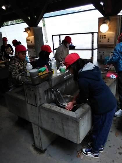 火おこしでおこした火を使って,かまどに火をつけました。野外炊事も慣れた手つきで手際よく進めています。