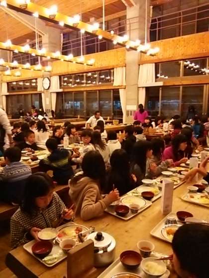 花背山の家での最後の入浴も終わり,食堂で夕食を取っています。食事が終われば,いよいよキャンプファイヤーです。