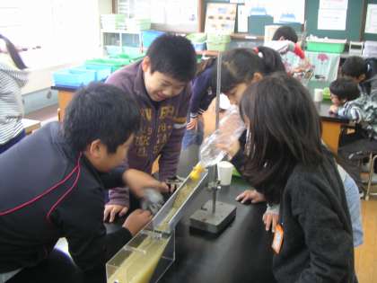 6年生の「土地のつくりと変化」の学習では,流れる水のはたらきによる地層のでき方を調べる実験をしました。