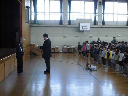 続いて長年,部活動卓球の指導に関わっていただいた地域指導者の方に感謝状を送らせていただきました。部活動はもとより,毎日様々な場所で地域の方に学校教育を支えていただいております。ありがとうございます。