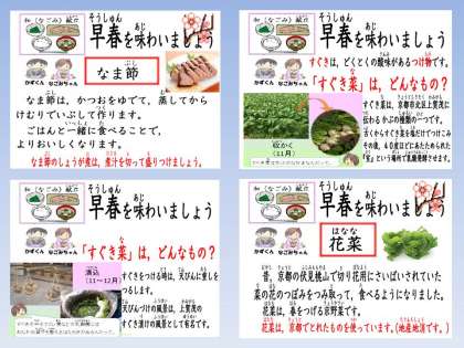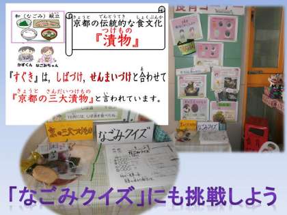 暦の上では,節分を過ぎると‘春”とされていることから,今月は「早春を味わう献立」にしました。また,京都の伝統的な漬物の一つ「すぐき」を使用した献立を取り入れ,京都の三大つけものについても,玄関前の食育コーナーに実物を展示して紹介しました。