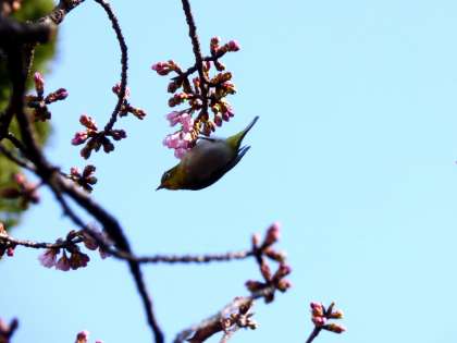 たくさんメジロが来て、花をついばんでいました。