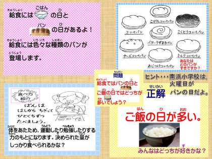 「だいずとけい肉のトマトにのだいずにもあじがついていておいしかったです。給食の中のパンでは,わたしは,チーズコッペパンがすきです。」・・・5の2