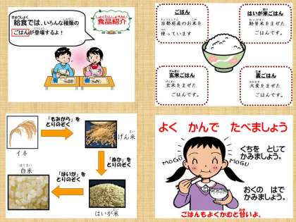 今日は,給食カレンダーや電子紙芝居『給食室からこんにちは』で,給食に出てくるごはんの種類を紹介しました。給食では,京都府内産のお米を使っています。麦ごはんは,大麦を混ぜたごはんです。今日は麦ごはんです。