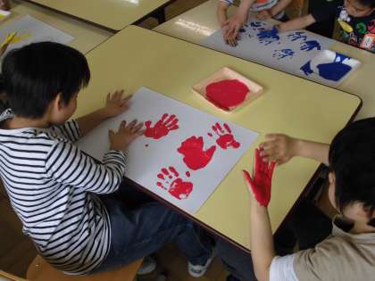 絵の具の感触や温度,手形を押すことの楽しさを味わいました。