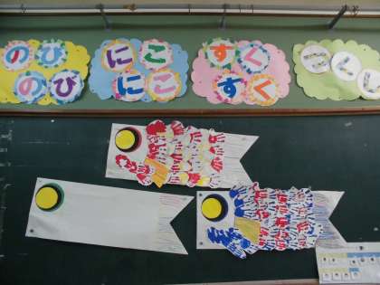 写し取った手形をみんなで切り取り,こいのぼりのうろこにして製作中です。