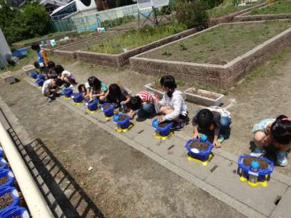 お待ちかね〜!!アサガオの土入れをして種を植えました。