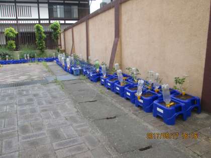 チューリップの あとの 植木バチに 新たに 土を入れ,ミニトマトの苗を 植え付けました。