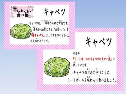 「キャベツがやわらかくておいしい。ジャガイモのソテーがにんじんとの色もあっていてとてもおいしかったです。春キャベツは,やわらかくて,あま味があることを知りました。」・・・5の1
