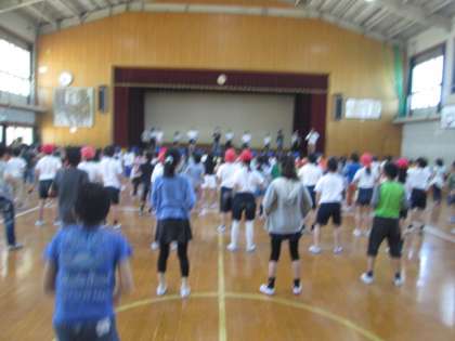 中間休みに,青組の全校ダンスの練習をしました。曲に合わせて,ダンス&準備体操を行います。団体演技のダンスをしている子どもたちは,すんなりと全校ダンスを覚えて踊っていました。