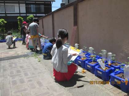 算数で 学習している ものさしで 苗の 高さ(長さ)を はかりました。