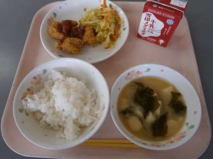 「みそしるのきりふがやわらかくておいしかったです。チキンカツがカリカリしていておいしかったです。いつもおいしいきゅう食をありがとうございます。」・・・つくし