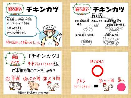 「今日のチキンカツを食べていると口の中でサクサクしている音が 口の中でひびいた音もよかったし味もすごくおいしかったです。」・・・3の3