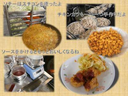 「久しぶりのチキンカツでうれしかったです。ソテーもこのときにしかでないのでうれしかったです。他のときにもぜひ だしてください。チキンカツがサクサクでおいしかったです。」・・・6の1