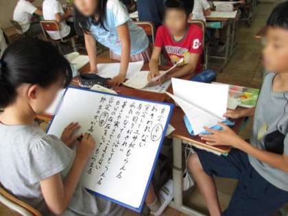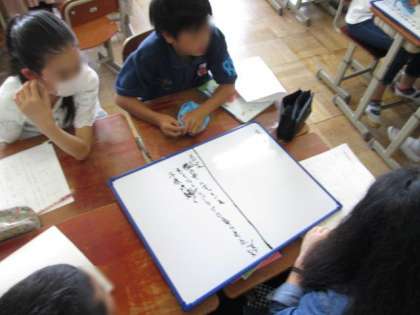 国語「学級討論会をしよう」の学習の様子です。1組では,「動物園の動物は幸せか」をテーマに,肯定派・否定派・聞くグループに分かれて討論会をする準備をしています。