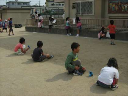 ある班が,カガミを地面に置いて,光の調節をはじめたのを見て