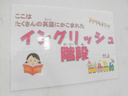 そこで,子どもたちにも親しみやすい名前をつけることにしました。音楽室へつながる「ミュージック階段」,英語があふれる「イングリッシュ階段」,図書館へとつながる「ライブラリー階段」,給食室への行き帰りによく使う「もぐもぐ階段」の4階段です。