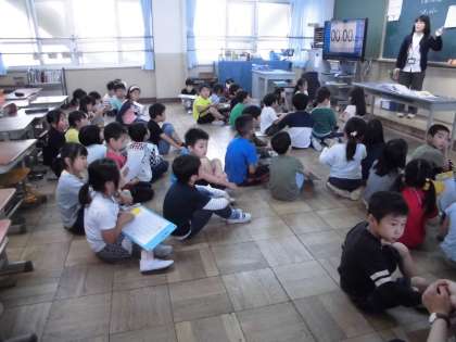 2年生のお姉さん,お兄さんに優しく学校を案内してもらいました。学校にはいろんな教室があることがわかりました。初めて入る部屋がたくさんあり,「うわあ,こんなものがあるんだね。」と目をきらきらさせながら探検しました。
