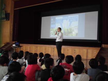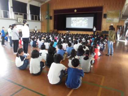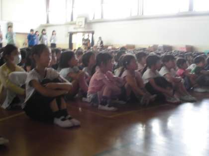 16日(水),朝会を行いました。5月の「なかよし学習」は,朝会で校長先生から憲法や決まりの話を聞き,それを受けて,学級で人権標語について考え話し合うという内容です。今年度は,「あいさつは人と人をつなぐ」ということで,あいさつに力を入れようと考えています。子どもたちはみんな真剣に話を聞いていました。各学級で考えた人権標語は,詩の広場に掲示する予定です。