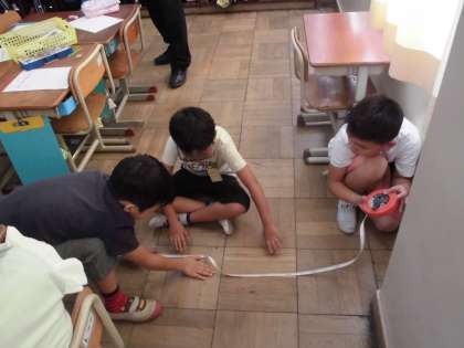 算数科の学習で巻尺を使って長さを測る学習をしました。巻尺を使い方を聞き,長さを予想してから実際に長さを測りました。「予想と全然違った!」や「思ったより短かった」などいろいろな感想をもてた3年生。いろいろな所を測りながら,どれくらいの長さか,長さの感覚が身に付いてくれたらいいなと思います。