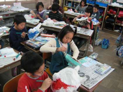 オニのお面を図工で作っています。