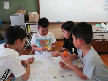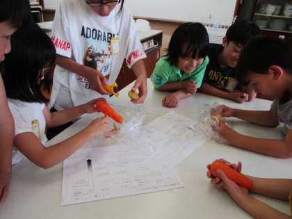 4年生は来週宿泊学習でみさきの家に行きます。今日はみさきの家での野外炊事に向けて材料係りと火の係りに分かれて材料の切り方や火の点け方について学びました。材料係りは野菜を皮むき器でむく練習をしたり,実際に野菜を切っているところを見たりしました。火の係りは薪の組み方などを教えてもらいました。当日は,上手に役割分担をしておいしいカレーが作れたらいいなと思っています。