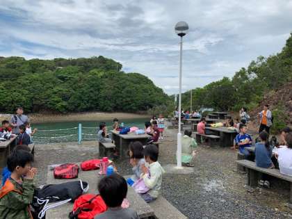おうちから持参した昼食をいただきました。5月のすがすがしい空気のもと,広々とした野外炊事場でいただくごはんは格別です。向こうに見えるのは深谷水道。英虞湾と太平洋をつないでいます。