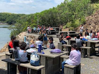 このあと 活動開始です。みさきの家の所内たんけん。お天気はみんなの活動に合わせるかのように回復しました。この写真,ちょっとしたリゾート地みたいですね。気持ちよさそう!