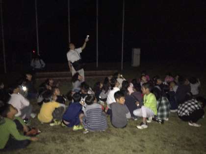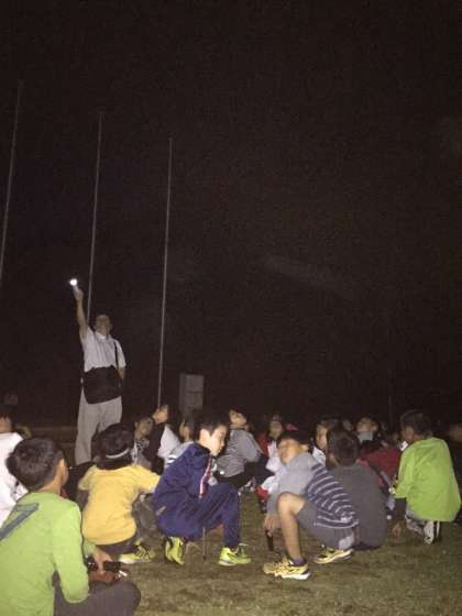 みさきの家1日目の夜は ナイトハイク。お天気に恵まれたので星空観察ができました。校長先生のスペシャルなレクチャーつきで星空をながめました。京都の街中とは違って ここは夜空が真っ黒で,星がはっきり濃く見えます。北斗七星の柄のカーブを伸ばして「うしかい座」のアルクトゥールス,「おとめ座」のスピカに続く大きな曲線=春の大曲線を見つけました。